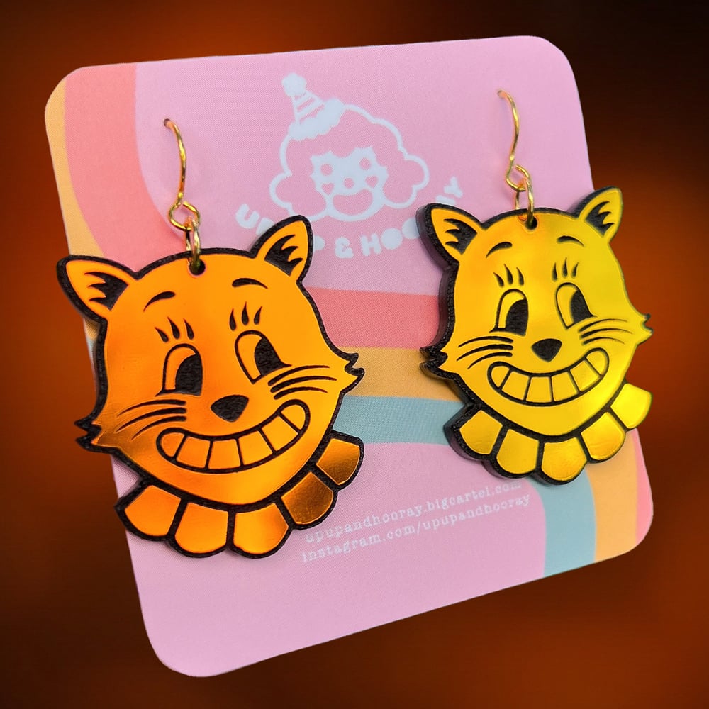 Engraved black iridescent acrylic earrings, shifts colors of green, orange, and red.