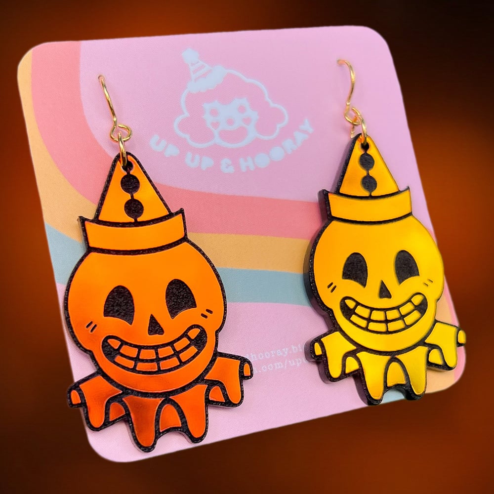 Engraved black iridescent acrylic earrings, shifts colors of green, orange, and red.