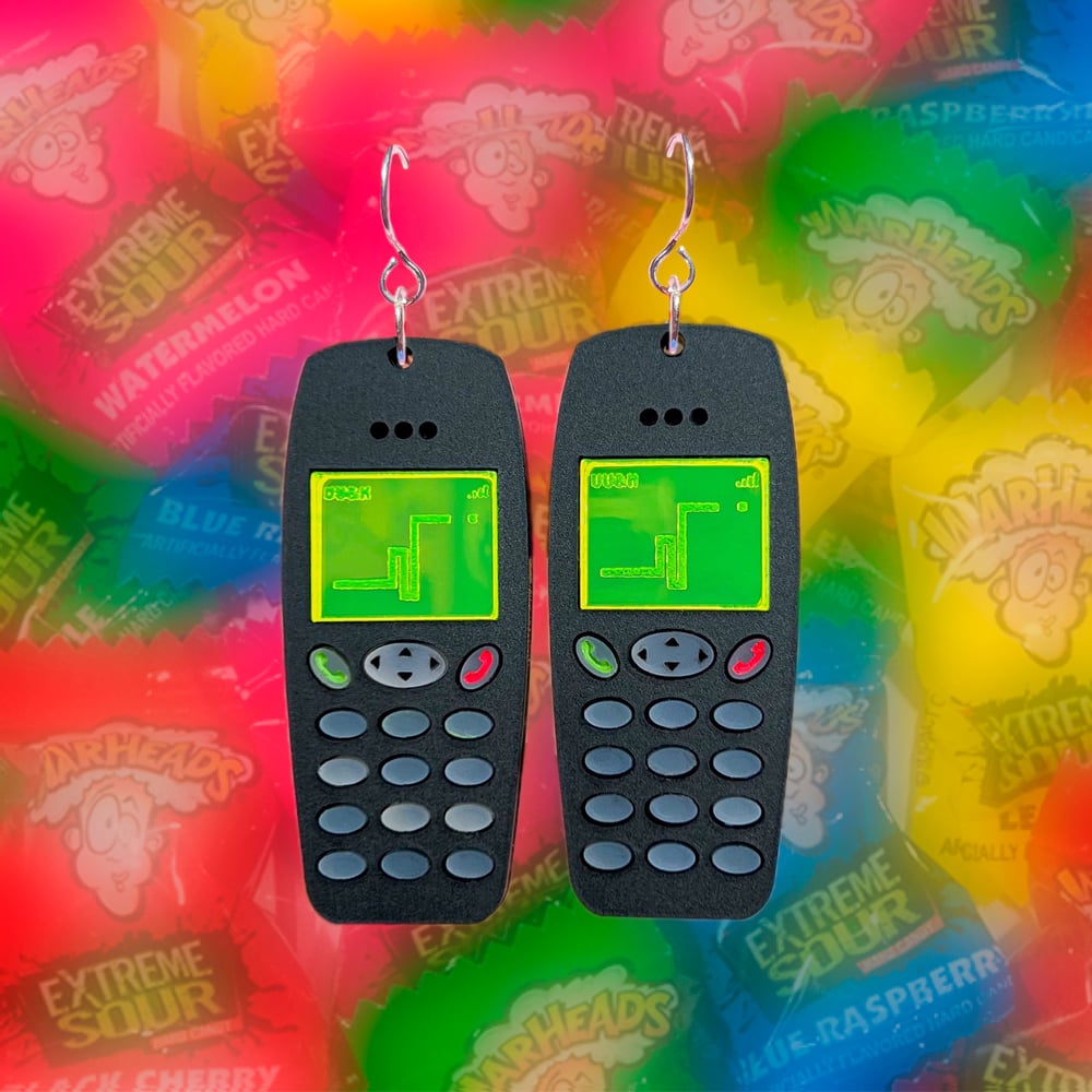 Matte black brick phones with frosted clear buttons and neon green mirrored screens with the game snake on.